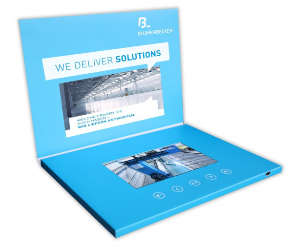 Gevouwen kaart gedrukt in klantontwerp met geïntegreerd IPS-display. Formaat: DIN A5, DIN A6 of DIN lang, andere formaten op aanvraag. Print: 4/0 gekleurd + matte of glanzende vernis. Inclusief: video-opname, startlogo, maximaal drie bedieningsknoppen. Prestaties: 5 "IPS-scherm (109 x 61 mm) voor haarscherpe beelden vanuit alle hoeken, resolutie: 854 x 480 px, 2 uur batterijduur, 256 MB opslagcapaciteit, geïntegreerde luidspreker, met punch-out op aanvraag, videogegevens optioneel uitwisselbaar of beveiligd met een wachtwoord .