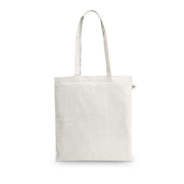 Tas van gerecycleerd katoen (70%) en polyester (30% rPET) (150 g/m²), met handgrepen van 65 cm. Gerecycled katoen is effen en ongeverfd. De grondstof wordt gebruikt in zijn oorspronkelijke vorm en kleur, zonder gebruik van verf- of bleekchemicaliën, wat bijdraagt aan een lagere impact. De unikleur wordt verkregen door gerecycled garen met dezelfde tint te kiezen, en onzuiverheden en kleurvariaties kunnen voorkomen. 380 x 420 mm