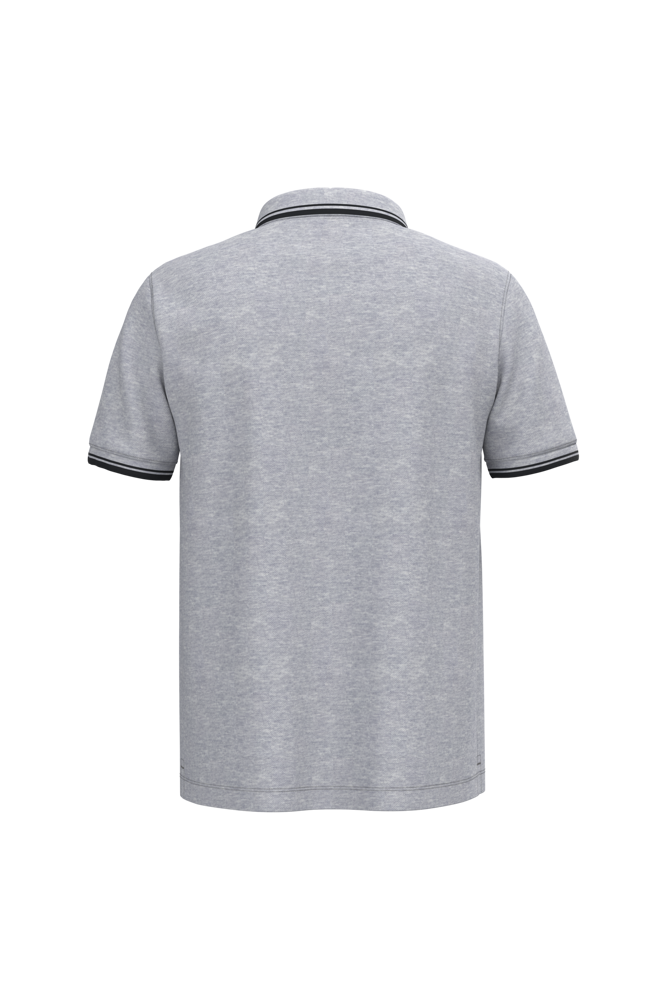 100% katoen. Voor de gevlamde kleuren: 92% katoen / 8% viscose. Gekamd katoen. Piquétricot. Rechte snit. Knooplijst met 2 toon-op-toon knopen aan de kraag. Nektape in de hoofdstof in de kraag. Zijsplitten met een afwerkingsboord in de hoofdstof. Ribboord met contrasterende biesjes aan kraag en mouwuiteinden. Dubbel stiksel aan de onderkant.