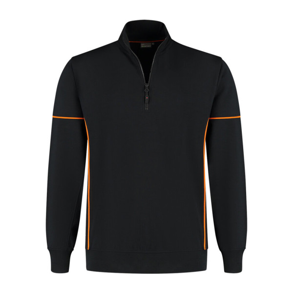 Zipsweater met contrast piping, 50% gerecycled polyester / 48% organisch katoen / 2% elastan (GRS gecertificeerd), 320 gr/m², French terry met geruwde binnenzijde, unisex, regular fit met opstaande kraag en korte YKK ritssluiting met puller, mouw met contrast piping, tailleband en mouw met 1x1 ribboord, 3D logo transfer op onderzijde.