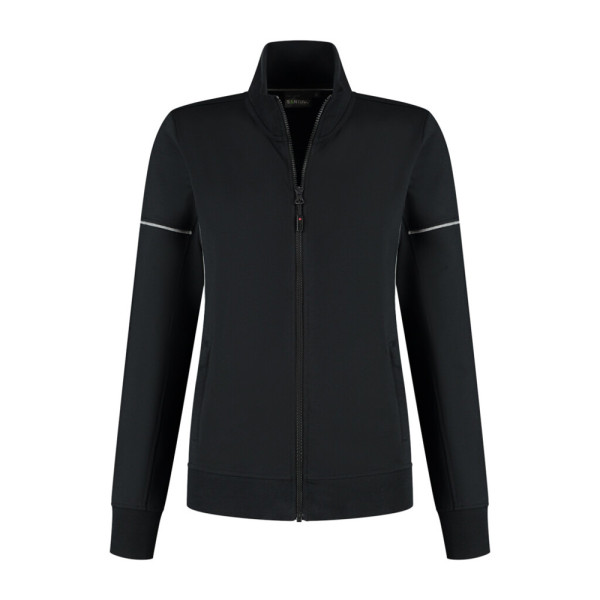 Sweatvest met contrast piping, 50% gerecycled polyester / 48% organisch katoen / 2% elastan (GRS gecertificeerd), 320 gr/m², french terry met geruwde binnenzijde, ladies fit, opstaande kraag, voorsluiting YKK rits met puller, 2 steekzakken met YKK rits en puller, mouw met contrast piping, tailleband en mouw met 1x1 ribboord, 3D logo transfer op onderzijde.