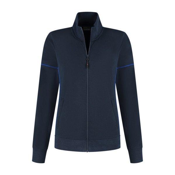 Sweatvest met contrast piping, 50% gerecycled polyester / 48% organisch katoen / 2% elastan (GRS gecertificeerd), 320 gr/m², french terry met geruwde binnenzijde, ladies fit, opstaande kraag, voorsluiting YKK rits met puller, 2 steekzakken met YKK rits en puller, mouw met contrast piping, tailleband en mouw met 1x1 ribboord, 3D logo transfer op onderzijde.