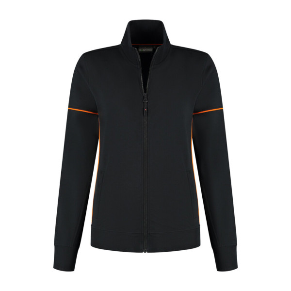 Sweatvest met contrast piping, 50% gerecycled polyester / 48% organisch katoen / 2% elastan (GRS gecertificeerd), 320 gr/m², french terry met geruwde binnenzijde, ladies fit, opstaande kraag, voorsluiting YKK rits met puller, 2 steekzakken met YKK rits en puller, mouw met contrast piping, tailleband en mouw met 1x1 ribboord, 3D logo transfer op onderzijde.