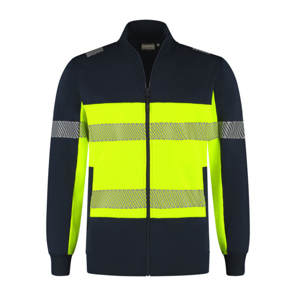 Fluorescerend veiligheids-sweatvest, conform de Europese norm EN 17353:2020 - AB3, double face materiaal: buitenzijde 75% gerecycled polyester / binnenzijde 25% katoen (GRS gecertificeerd), 320 gr/m2, unisex, French terry met geruwde binnenzijde, modern fit, opstaande kraag met 1x1 ribboord, tailleband en mouw met 1x1 ribboord, voorsluiting YKK rits met puller, 2 steekzakken met YKK rits en puller, reflecterende gesegmenteerde LOXY tape op de schouder, mouwen en rondom het lichaam.