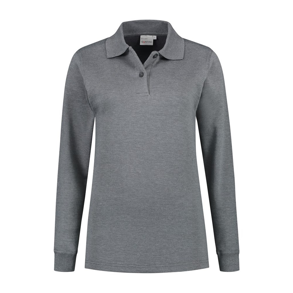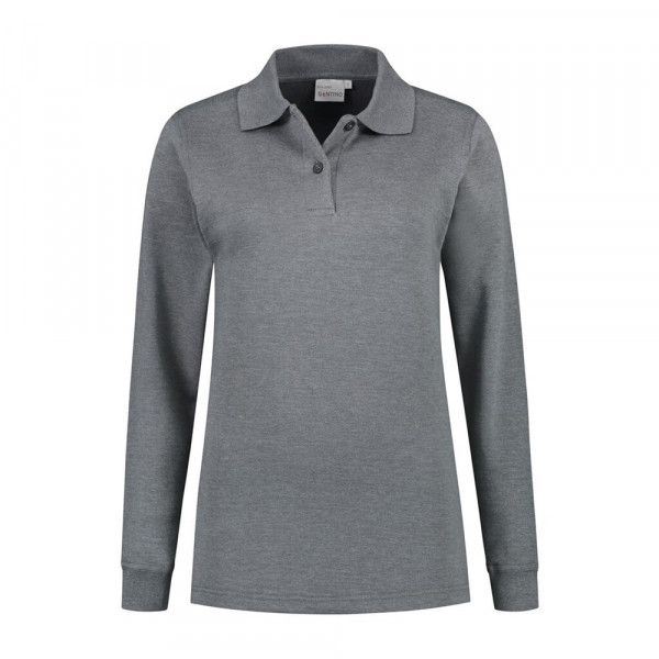 Polosweater, 50% katoen / 50% polyester, 280 gr/m², french terry met geruwde binnenzijde, ladies fit met polokraag, 2-knoopsluiting, mouw met ribmanchet en splitjes in zijnaad.