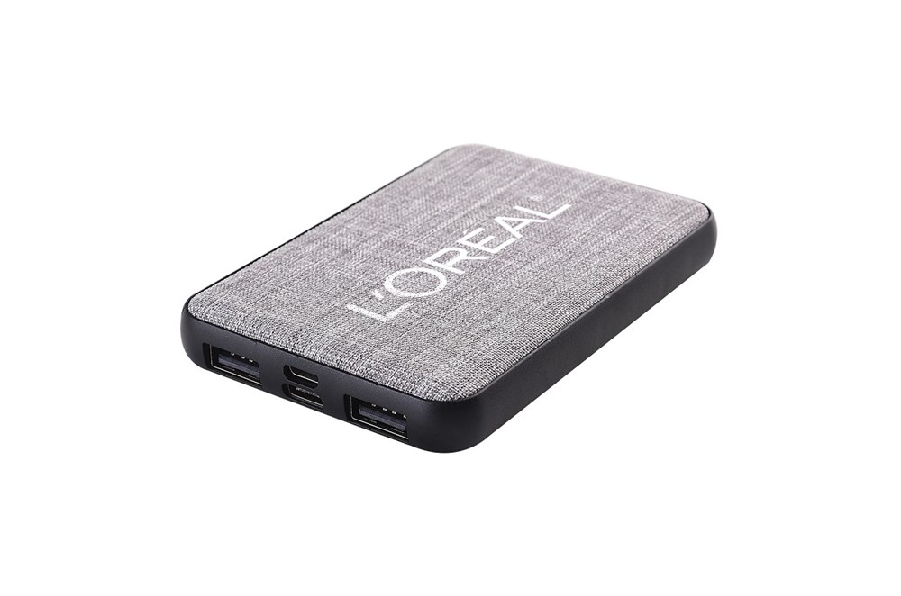 De CM5143 Power Banks is vergelijkbaar met de Snobby 10.000 maar dan met 5.000 mAh. Voor de CM5143 heeft de fabriek 2 gerecyclede flessen van 1 liter gebruikt om één powerbank te produceren die een capaciteit heeft van 5.000 mAh, Input 5V/2A, en output 5V/2A. Er zijn 2 USB poorten, 1 Type C en 1 Micro USB. Op de voorkant van de CM5143 vindt u ook een mooie textuur van grijze stof dat bedrukt kan worden in 1 of meerdere kleuren. Om het geheel compleet te maken is de powerbank verpakt in een gerecycled papieren doosje, bedrukt in 1 kleur met soja inkt.