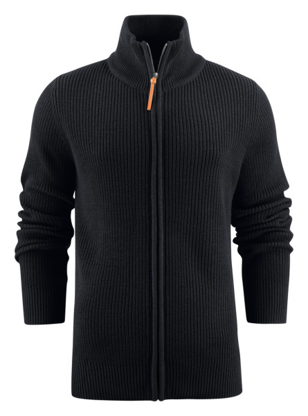 Zwaar gebreide vest met volledige ritssluiting in metaal met leren zippuller. Elleboogstukken (platgebreid in dezelfde garen) op de mouwen. Ribboord aan de manchetten, de zoom onderaan en de dubbelgelaagde kraag.