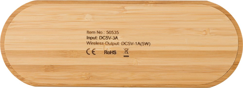 Bamboe draadloze, dubbele lader. Input: DC5V-3A, output: 2x DC 5V/1A. Inclusief USB kabel.