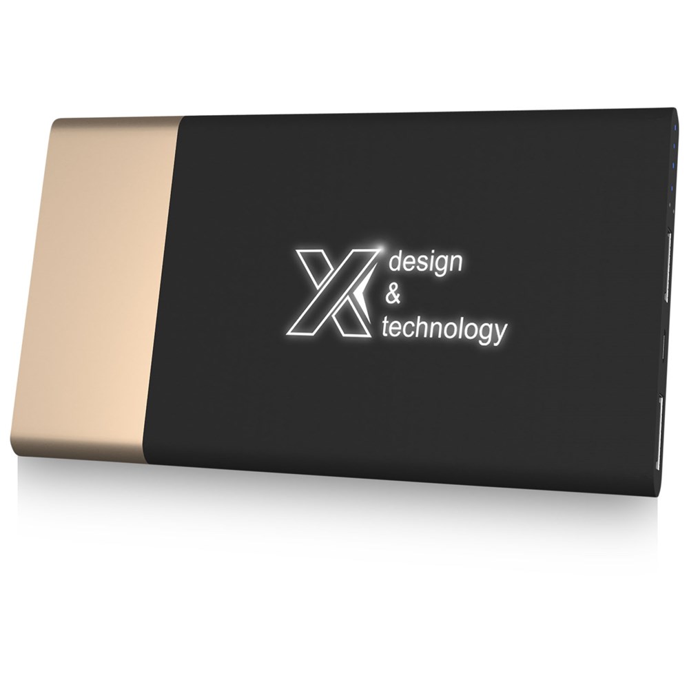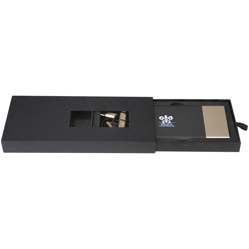 5000 mAH powerbank met oplichtend logo en een 3-in-1 RPET (Type C, Android, iPhone) snelle oplaadkabel in dezelfde kleur als de powerbank. Het apparaat licht door de "schudfunctie" op wanneer het wordt aangeraakt en het logo kan maximaal 20 dagen verlicht blijven zonder dat de batterij wordt opgeladen. Capaciteit: 5000 mAh. DC-ingang: 5V/2 A micro USB. DC dubbele uitgang: 5 V/2.1 A en 5 V/1 A snel opladen. Nettogewicht: 138 gram. Afmetingen: 127 x 70 x 12 mm. Geleverd in een geschenkverpakking gemaakt van gerecycled papier.